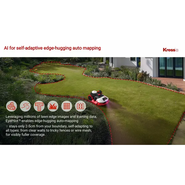 Maak kennis met de Kress EyePilot KR260ES, dé robotmaaier die jouw gazon volledig zelfstandig en zonder perimeterdraad perfect onderhoudt. Dankzij innovatieve technologieën zoals RTK-satellietnavigatie en slimme cameradetectie maait deze robot tot op de centimeter nauwkeurig, zelfs in complexe tuinen met obstakels of schaduwzones.